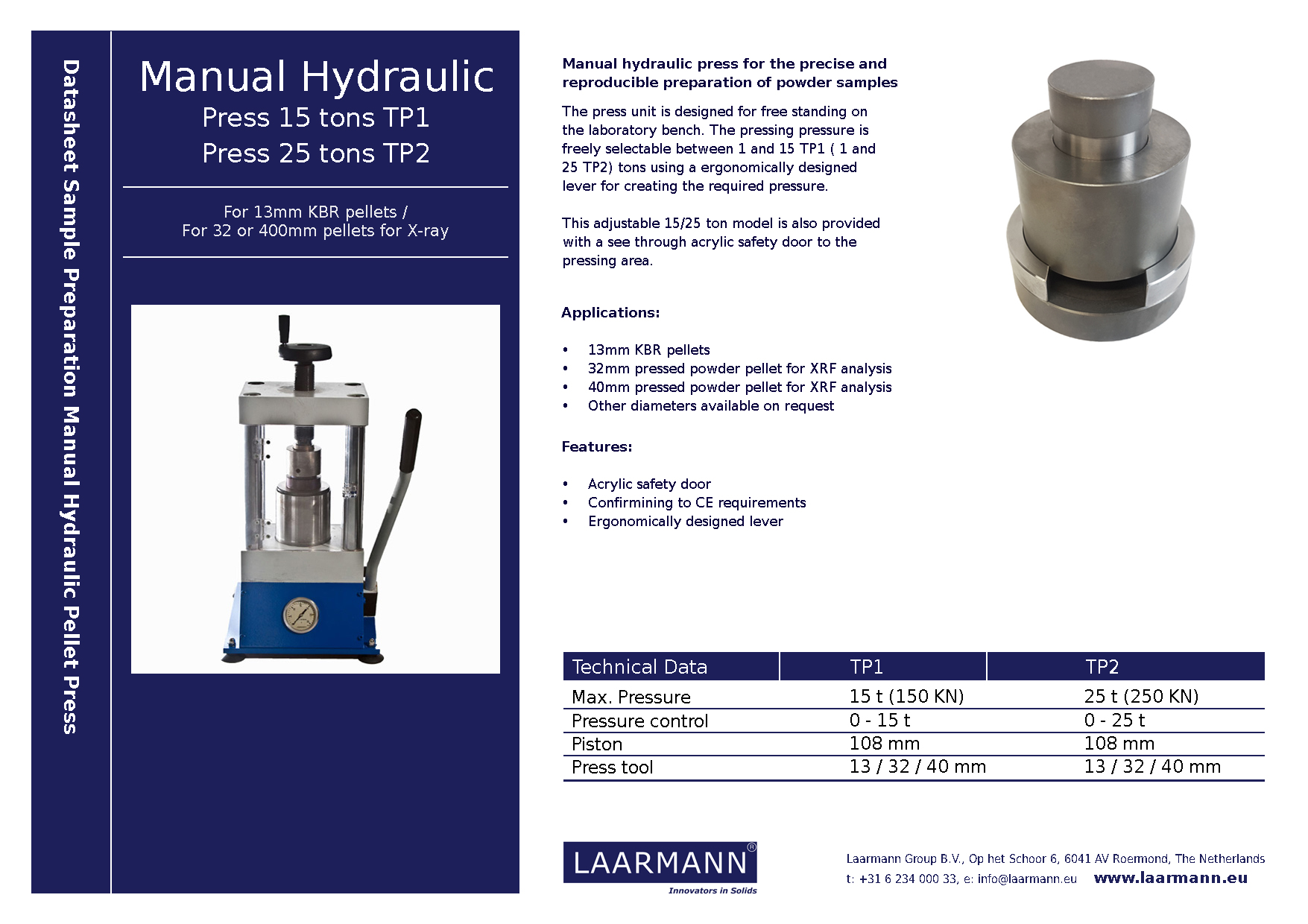 Manual Hydraulic Pellet Press for the precise and reproducible preparation of powder samples. The press unit is designed for free standing on the laboratory bench. The pressing pressure is freely selectable between 1 and 15 tons using a ergonomically designed lever for creating the required pressure.