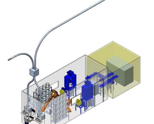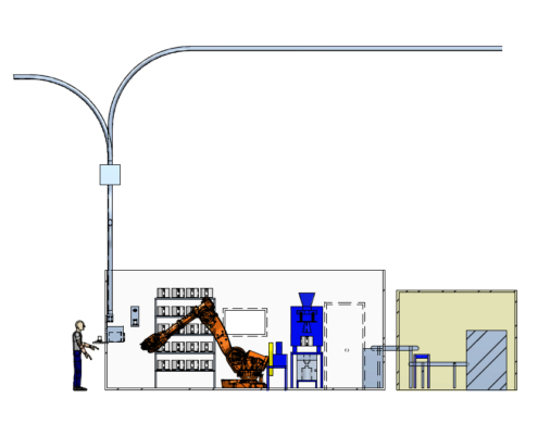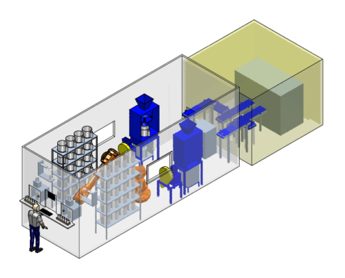Both sides of the cell contain a storage for copper, a LMC100D Crusher and a ABM – Auto Batch Mill. After the sample is crushed and grinded it gets pelletized and put on a conveyor belt to the analytic point where the X-ray fluorescence technique is being used to determine the coppers composition.
