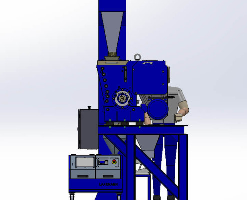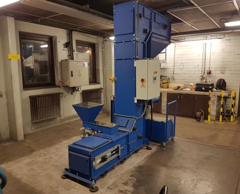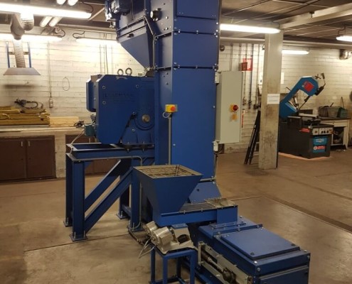 The operator puts 25 kilograms of material in the inlet funnel and starts the process at the central control box. A vibratory feeder underneath the inlet funnel evenly feeds the bucket elevator. The bucket elevator lifts the material and feeds the jaw crusher (type LMFC250) which reduces the material to 2mm.