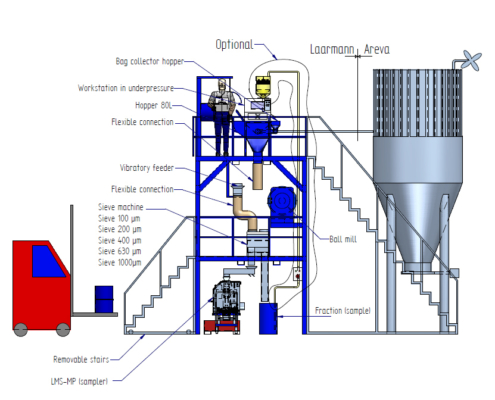 The waste material enters trough the hopper and goes down to the flexible connection. There it can can be attached to the Ball Mill for grinding or to the vibratory feeder where the material goes down to the Rotary Sample Divider where buckets catch the sample.