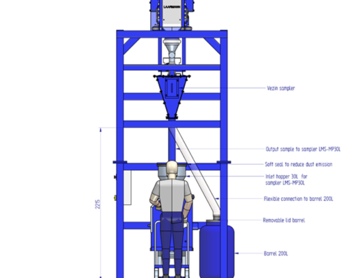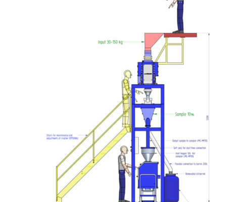 the sample is transported with an optional vibratory feeder into the LMFC250 Fine Crusher. the crushed sample is transported into the Vezin Sampler next the sample is divided with the Rotary Sample Divider 30-60L or transported into the barrel